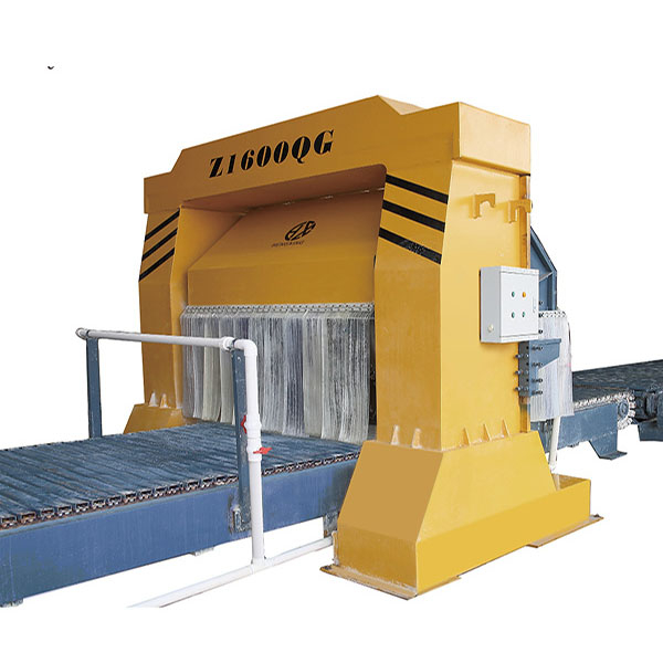 首先是通過Z1600QZ流水線切割機(jī),進(jìn)行第一次成品切割,Z1600QZ流水線切割機(jī)是采用金剛石刀頭,德國進(jìn)口鋼片制成的刀片精致而成經(jīng)久耐用。進(jìn)行完第一次流水線切割后,通過90翻轉(zhuǎn)機(jī)對坯體進(jìn)行水平方向90度旋轉(zhuǎn),改變切割方向。再通過扳倒機(jī)對改變過方向的坯體進(jìn)行翻倒,然后輸送給Z800QG切割機(jī),進(jìn)行第二次成品切割。